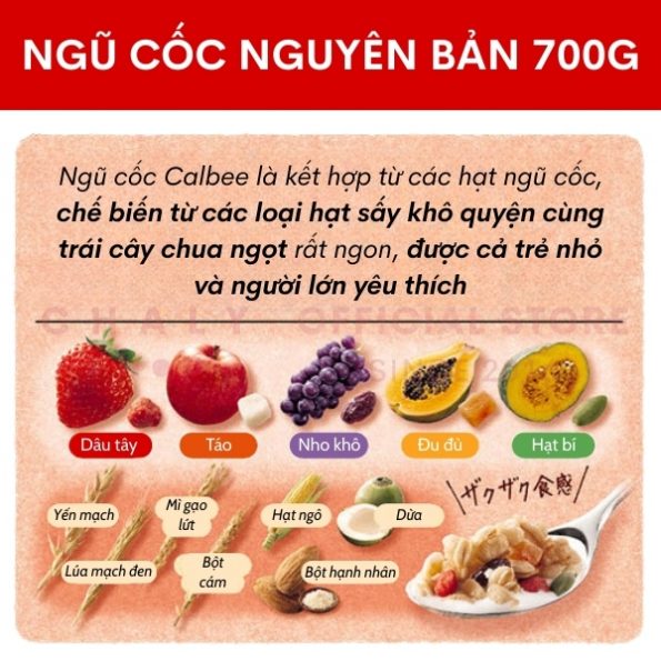 – Ngũ cốc Calbee là kết hợp từ các hạt ngũ cốc như yến mạch, lúa mạch đen, hạt bí, hạnh nhân cùng các loại trái cây như đu đủ, nho, táo, dâu mang hương vị độc đáo