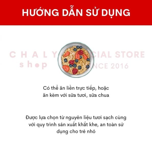 – Mục đích sử dụng: Bổ sung chất xơ, vitamin cần thiết cho cơ thể. Đồ ăn vặt, ăn sáng healthy hàng ngày