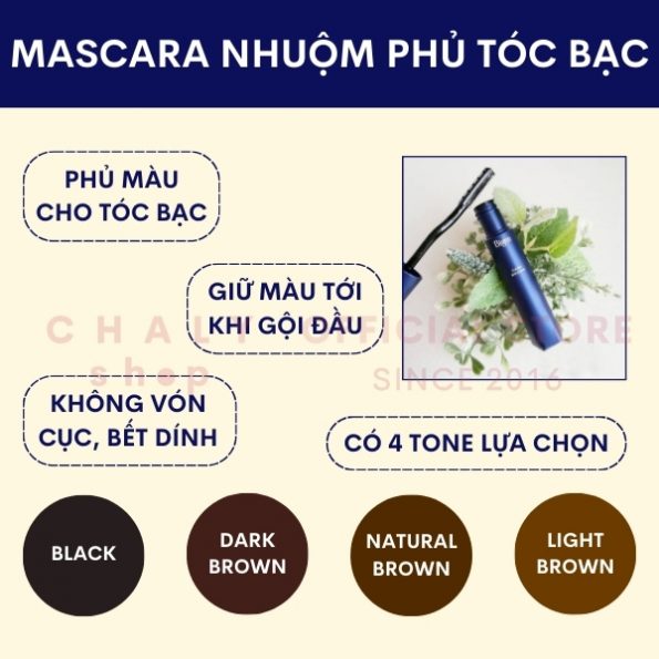 – Mục đích sử dụng: Phủ màu cho tóc bạc. Giữ màu tới khi gội đầu. Có 4 tone: Đen tự nhiên, Nâu đậm, Nâu tự nhiên và Nâu nhạt