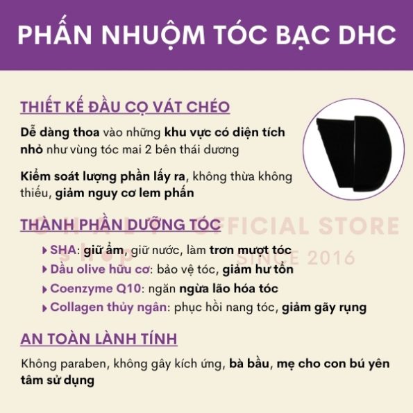 – Ở thuốc nhuộm DHC quick hair retouch color Nhật, đầu cọ được thiết kế vát chéo, giúp người dùng dễ dàng thoa thuốc nhuộm tạm thời DHC vào những khu vực có diện tích nhỏ như vùng tóc mai chéo ở 2 bên thái dương chẳng hạn (xem hình minh hoạ trên bao bì)