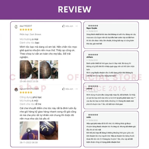 “Mình dùng nhuộm dhc cũng mấy mùa rồi, rất là thích. Cứ thấy có sợi tóc bạc mới nào nhú ra là mình lại phủ phấn luôn vào ^^