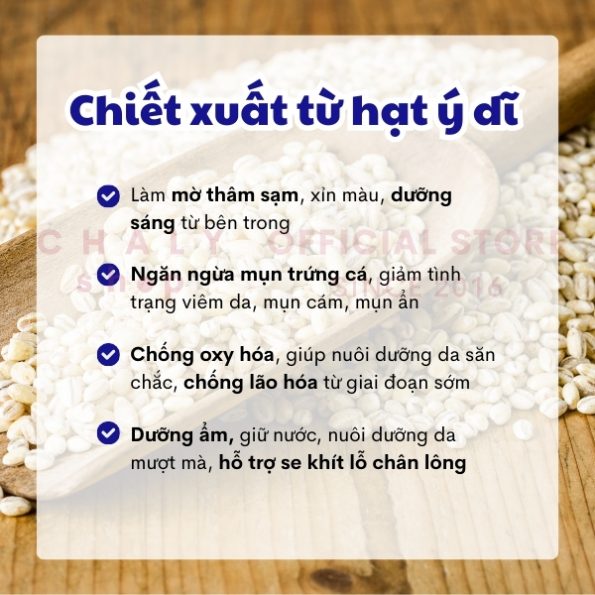 – Đồng thời, thành phần hạt ý dĩ còn thúc đẩy da tăng cường sản sinh ra chất giữ ẩm tự nhiên, giúp da luôn căng mọng, mịn màng không nếp nhăn, khoẻ mạnh