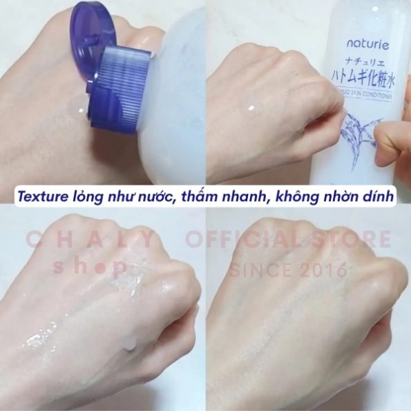 – Texture của Naturie toner lỏng như nước. Thấm lên da rất nhanh và tuyệt đối không hề nhờn dính, rất dễ chịu