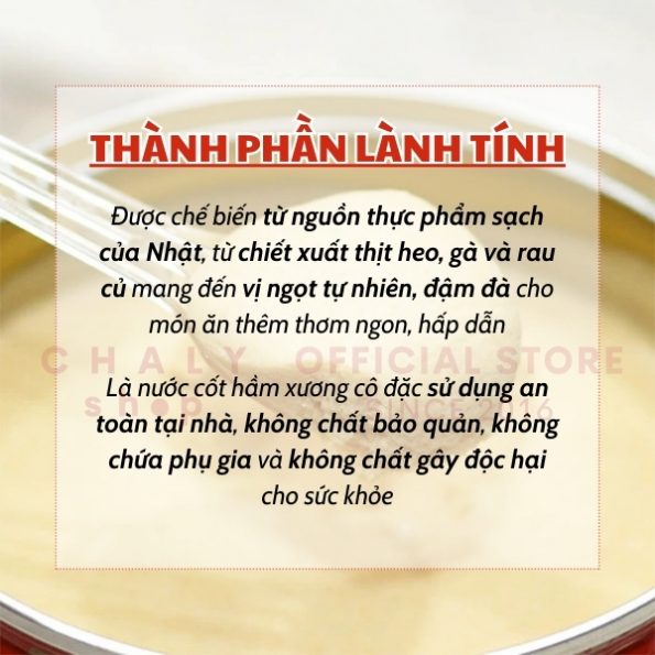 Được chế biến từ nguồn thực phẩm sạch của Nhật, từ chiết xuất thịt heo, gà và rau củ mang đến vị ngọt tự nhiên, đậm đà cho món ăn thêm thơm ngon, hấp dẫn. Không chứa phụ gia độc hại, không có chất bảo quản, sử dụng đơn giản tại nhà, chế biến nhanh chóng, tiện lợi