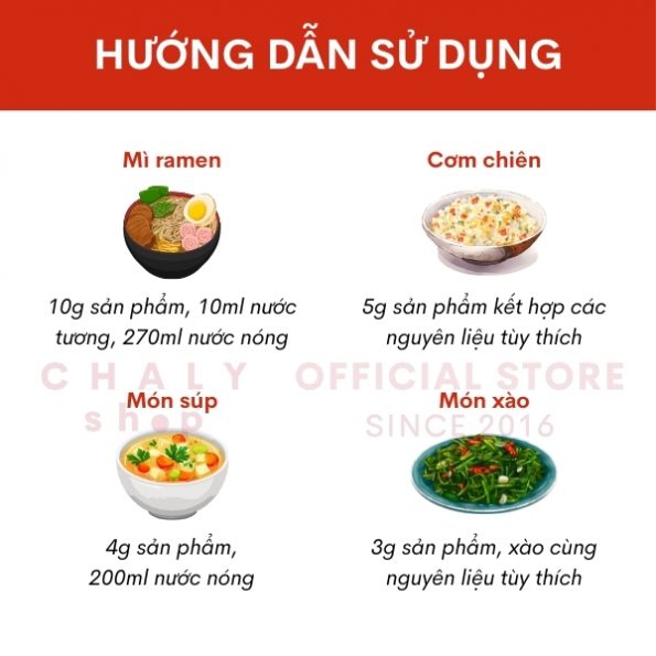 – Các món súp: 4g sản phẩm, 200ml nước nóng