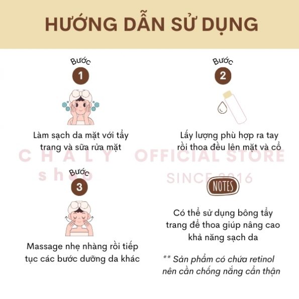 * Vì sản phẩm có chứa retinol nên cần chống nắng cẩn thận trong quá trình sử dụng