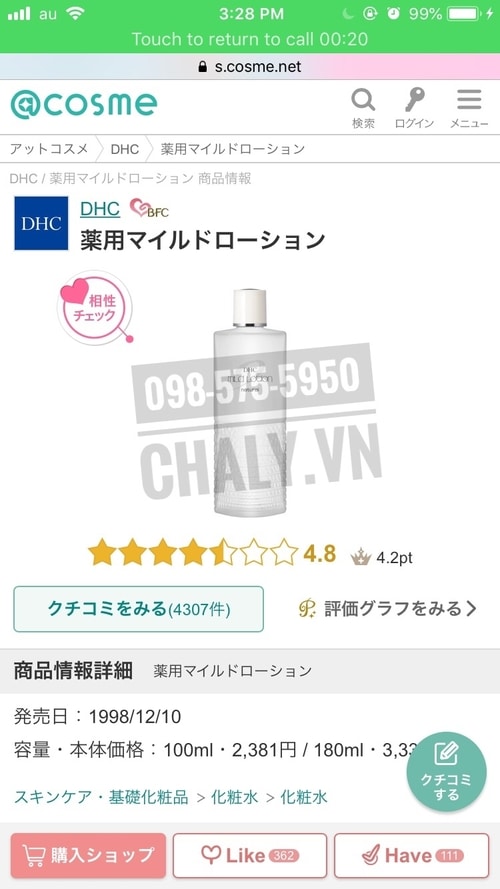 Review cực cao với hơn 4300 đánh giá trên Cosme Japan của nước hoa hồng DHC của Nhật DHC mild lotion