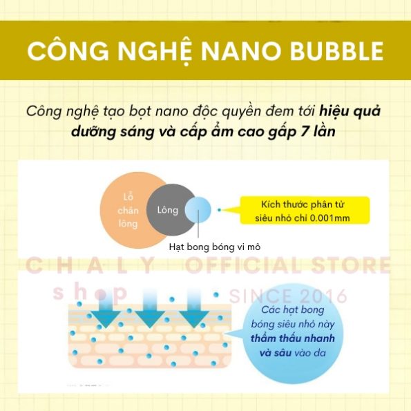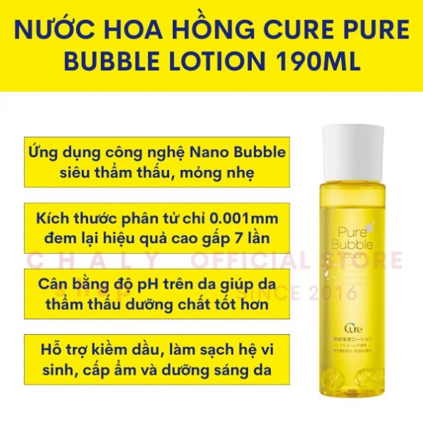 – Chai lotion Cure Pure Bubble, đúng như tên gọi ứng dụng công nghệ Nano Bubble siêu thẩm thấu, với kích thước phân tử chỉ 0.001mm sẽ đem tới hiệu quả dưỡng sáng và cấp ẩm cao gấp 7 lần các sản phẩm thông thường