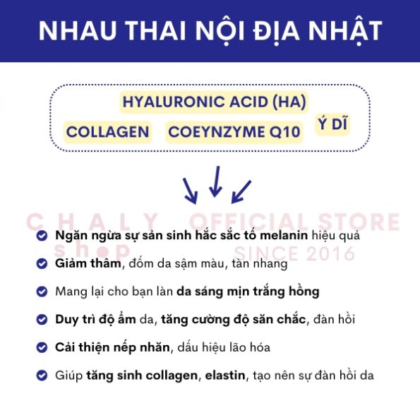 – Nhau thai Nhật được chọn lọc kĩ càng, đạt độ tinh khiết cao, được chứng minh mang trong mình sức mạnh ngăn ngừa sản sinh hắc sắc tố melanin ở da vô cùng hiệu quả