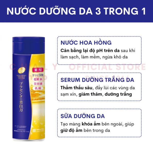 – Là sản phẩm nước dưỡng da đa năng 3 trong 1, Meishoku Placewhiter Whitening Essence Lotion một mình đảm nhiệm đồng thời 3 công dụng dưỡng da cơ bản chỉ trong 1 bước dưỡng da duy nhất. Gồm có
