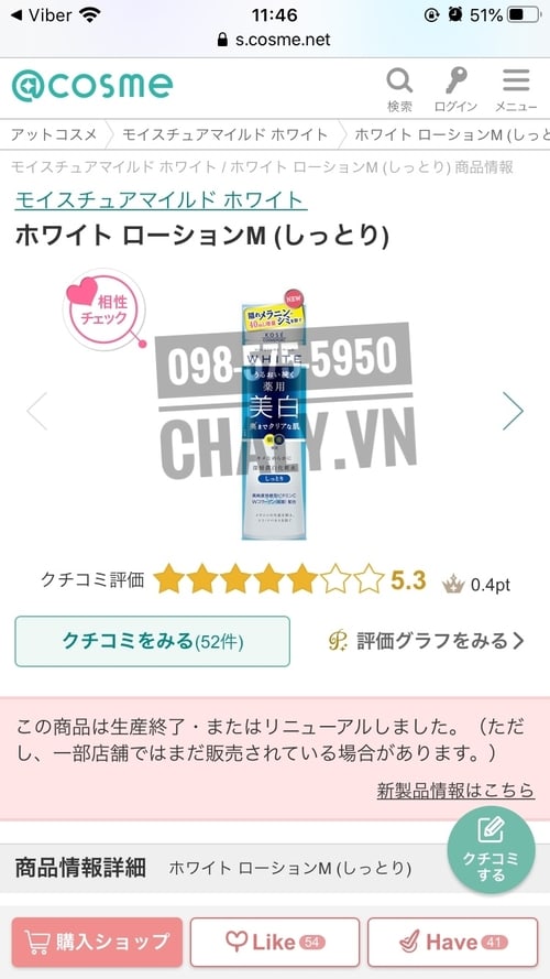 Lotion Kose moisture mild white của Nhật đạt số điểm review cực cao 5.3 trên chuyên trang đánh giá mỹ phẩm hàng đầu Cosme.net của Nhật Bản