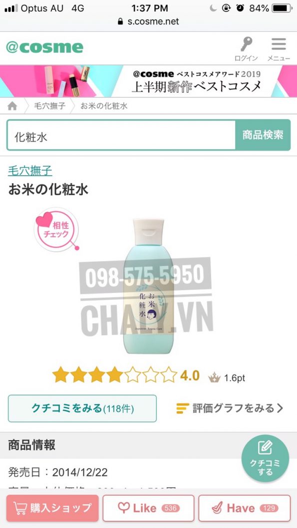 – Toner nước gạo Nhật lotion Keana được đánh giá rất cao trên Cosme Ranking, tận 4.0 với hàng trăm review khen ngợi