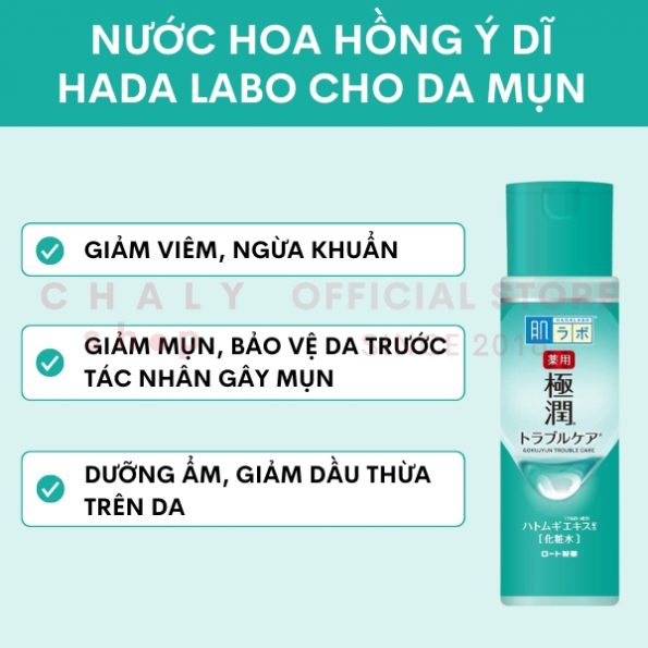 – Nước hoa hồng trị mụn Hada Labo tinh chất ý dĩ chứa những thành phần mang dược tính có khả năng tác động cải thiện tình trạng viêm và mụn trên da
