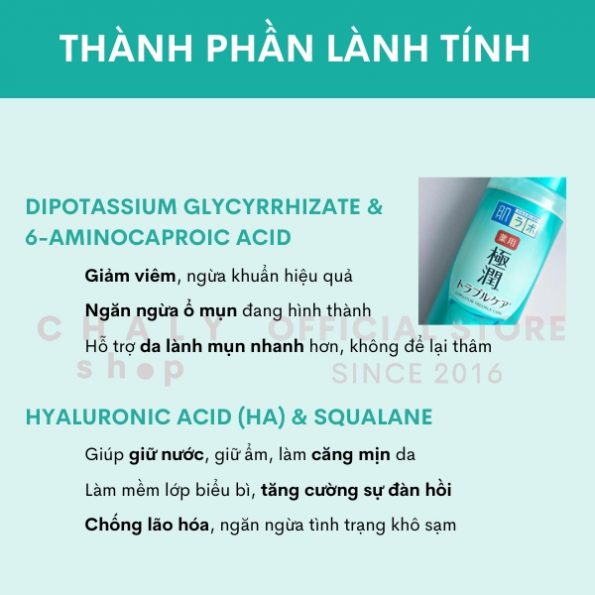 – Cụ thể đó là Dipotassium Glycyrrhizate và 6-Aminocaproic Acid. 2 thành phần này có khả năng kháng viêm, kháng khuẩn hiệu quả, nhờ đó ngăn ngừa những ổ mụn đang hình thành