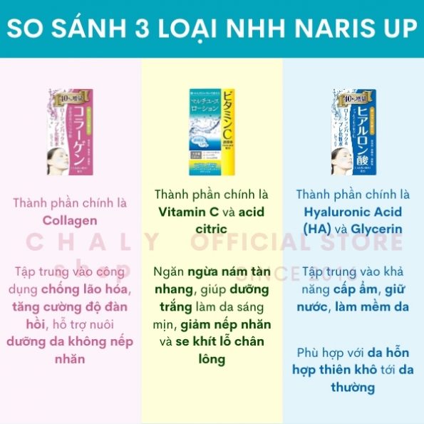 – Trong 3 loại, lotion Naris Up hyaluronic acid (スキンコンディショナーローションHA) có độ ẩm cao nhất, phù hợp da hỗn hợp thiên khô tới da thường
