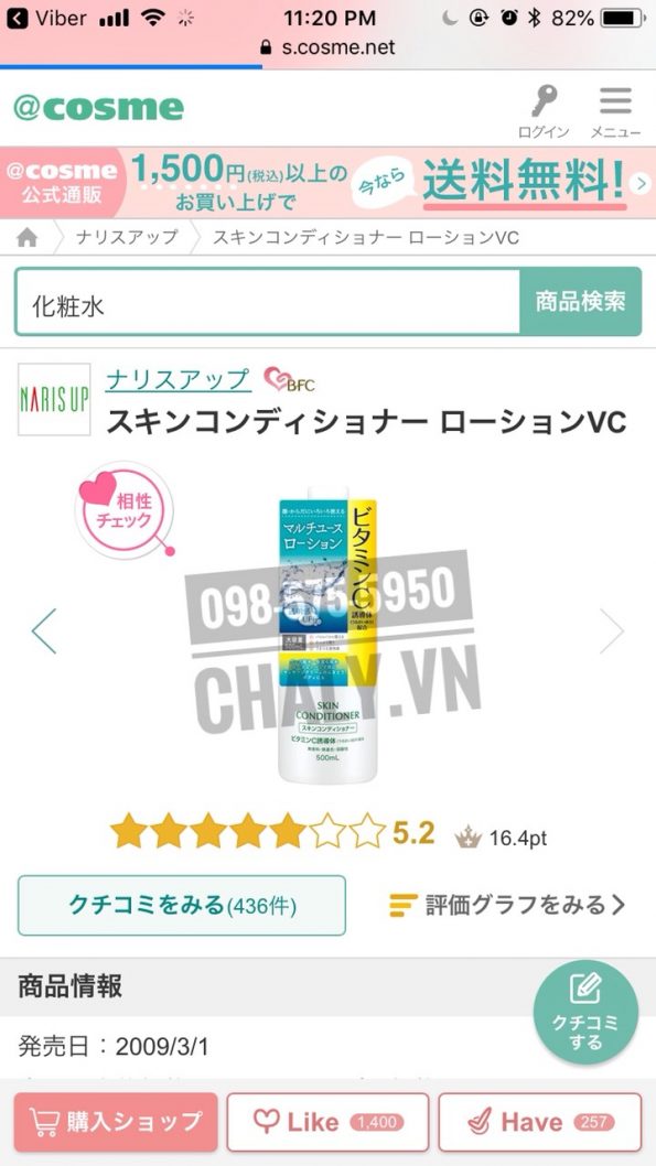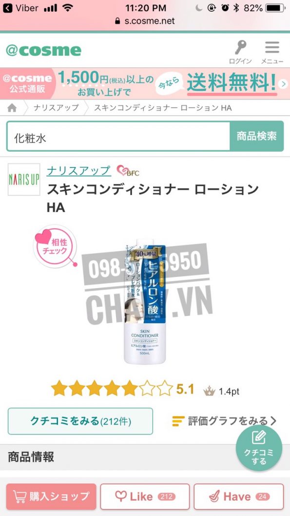 Naris Up vitamin c skin conditioner được chấm tới 5.2 với gần 500 review khen ngợi trên Cosme Ranking Nhật