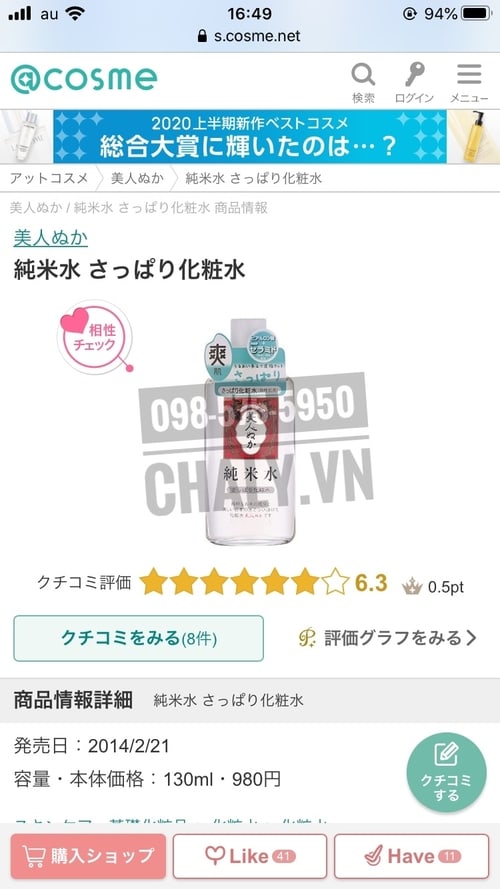 Siêu phẩm toner gạo Nhật này được chấm tới 6.3 trên chuyên trang review mỹ phẩm uy tín số 1 Nhật Bản Cosme.net (điểm tối đa là 7)