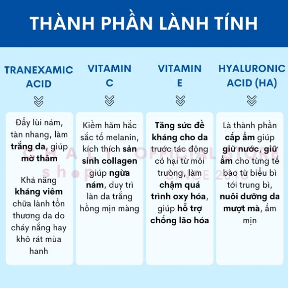 – Tranexamic acid là hoạt chất có công dụng đẩy lùi nám, tàn nhang, làm trắng da và chống oxy hoá cao cấp, thường chỉ xuất hiện trong các sản phẩm trị nám đắt tiền như kem dưỡng da trị nám Transino whitening repair cream