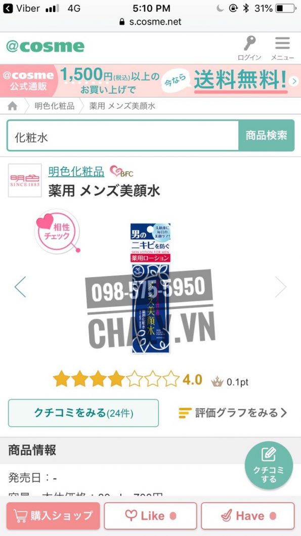 – Skin lotion meishoku 90ml trị mụn cho nam được review tận 4.0 trên Cosme Ranking