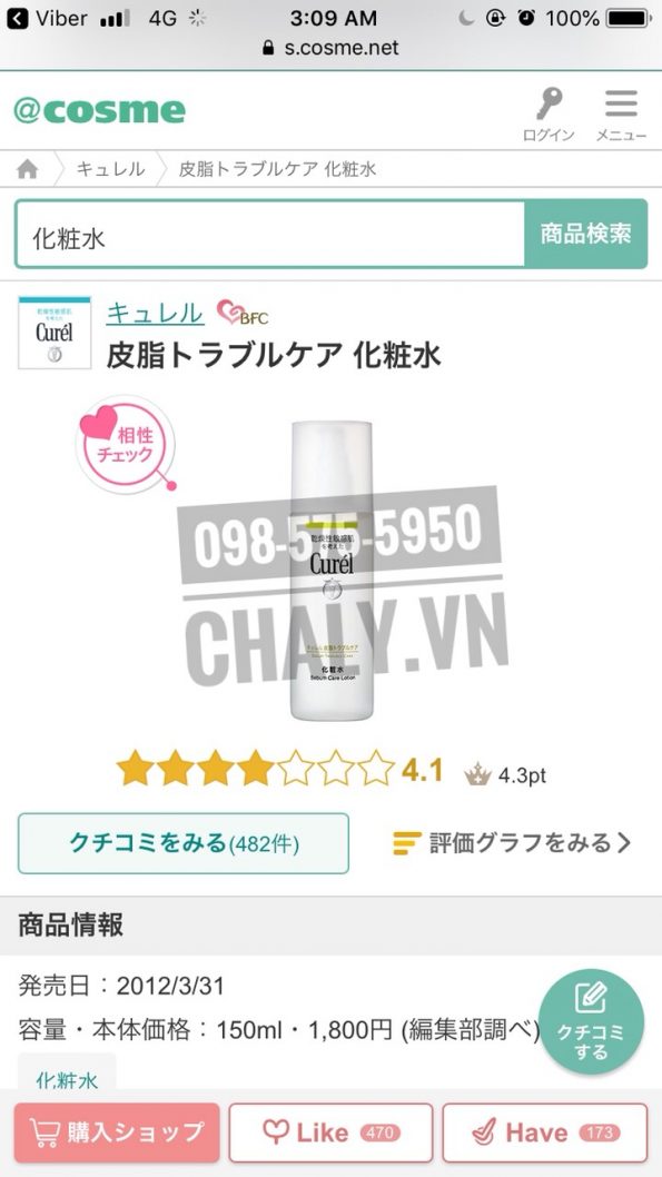 – Curel sebum trouble care lotion được chấm tới 4.1 trên Cosme Ranking với gần 500 đánh giá khen ngợi