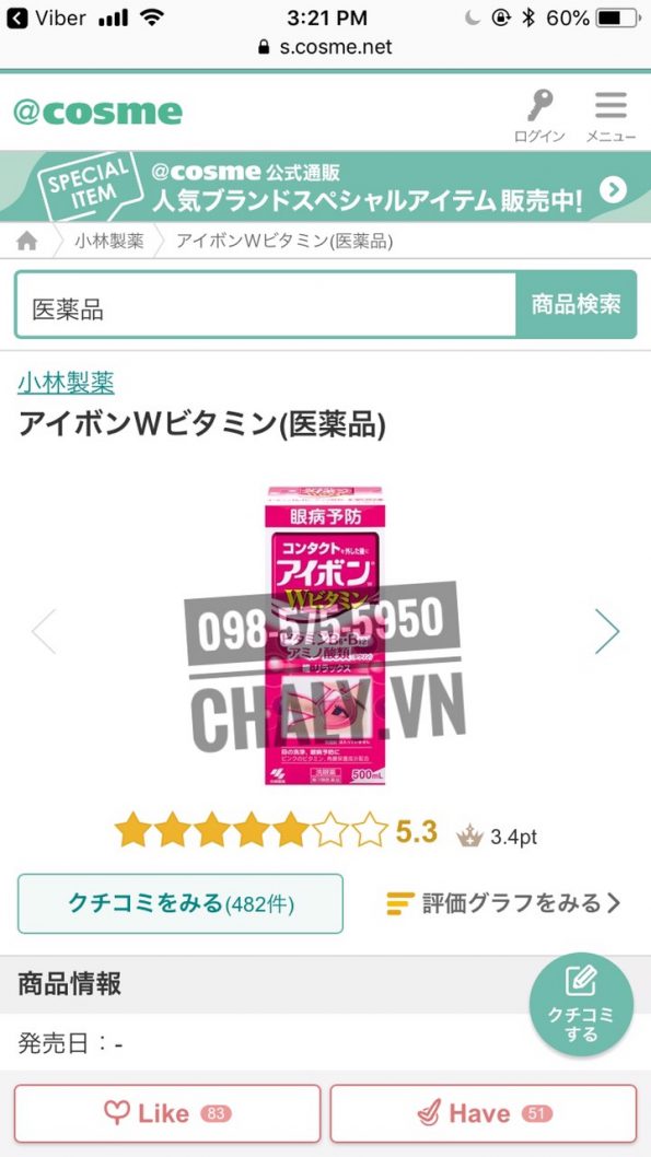 – Thuốc rửa mắt Eyebon của Kobayashi Nhật được review rất cao tận 5.3 điểm trên Cosme Ranking, và gần 500 đánh giá khen ngợi từ người dùng