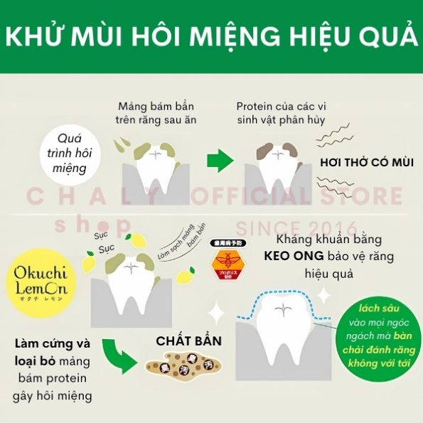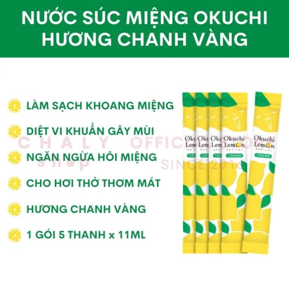 Okuchi Lemon Nhật sử dụng để làm sạch hiệu quả khoang miệng giúp tiêu diệt vi khuẩn gây mùi, ngăn ngừa hôi miệng, đẩy lùi nguy cơ hình thành mảng bám gây bệnh về răng miệng như viêm lợi, viêm nha chu về lâu dài