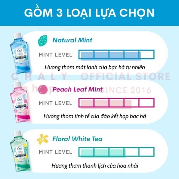 Gồm 3 mùi hương lựa chọn: Natural Mint (chai xanh dương), Peach Leaf Mint (chai hồng) và Floral White Tea (chai xanh lá), giúp ngăn ngừa mùi hôi răng hiệu quả, cho hơi thở sảng khoái, thơm tho