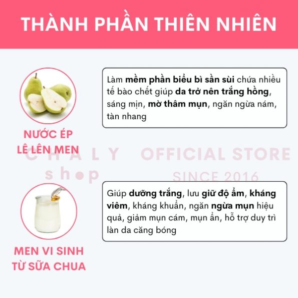 + Nước ép lê lên men và 1 số loại acid trái cây chứa hoạt chất tẩy da chết tự nhiên. Chúng giúp làm mềm phần biểu bì sần sùi chứa nhiều tế bào chết cùng hắc sắc tố melanin, sau đó hỗ trợ rửa trôi những cặn bã này khỏi da cùng nước sạch