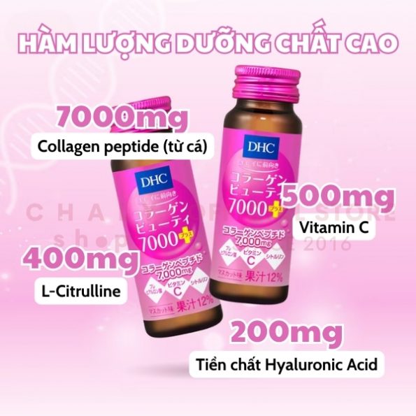 – Nhờ ứng dụng công nghệ “Beauty Plus” độc quyền, bên cạnh hàm lượng collagen vượt trội, collagen nước DHC còn được tăng cường bổ sung thêm hơn 1000mg các siêu dưỡng chất hỗ trợ nâng cao hiệu quả làm đẹp là: vitamin C, L-citrulline và tiền chất HA