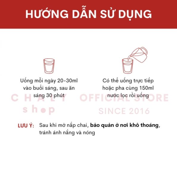 – Uống mỗi ngày 20-30ml vào buổi sáng, khoảng 30 phút trước khi ăn sáng là thời điểm tốt nhất