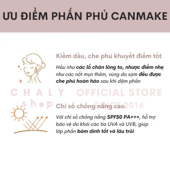 Phấn phủ Canmake của Nhật có công thức đặc biệt ngăn ngừa lớp trang điểm bị phai trôi do bã nhờn trên da tiết ra trong suốt cả ngày. Nhờ đó da giữ được tone màu sáng mịn, kiềm dầu hiệu quả, giảm tình trạng bóng nhờn, xỉn màu vào buổi tối