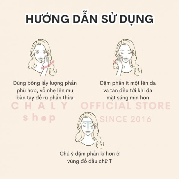 – Cách dùng: Dùng bông phấn lấy ra lượng phấn Canmake phù hợp, sau đó vỗ nhẹ lên mu bàn tay để rũ bớt phấn thừa. Dặm phấn lên da ít một và tán đều ra tới khi phấn bám đều, da mặt sáng mịn
