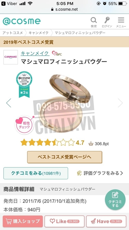 Phấn Canmake marshmallow Nhật giữ vị trí số 1 Cosme Ranking với gần 11 nghìn review khen ngợi