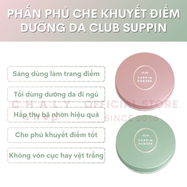 – Phấn phủ Club Suppin Powder C Nhật là phấn phủ dưỡng da thế hệ mới khi sở hữu 2 công dụng trong 1: sáng dùng làm trang điểm, tối dùng dưỡng da, không cần tẩy trang khi ngủ