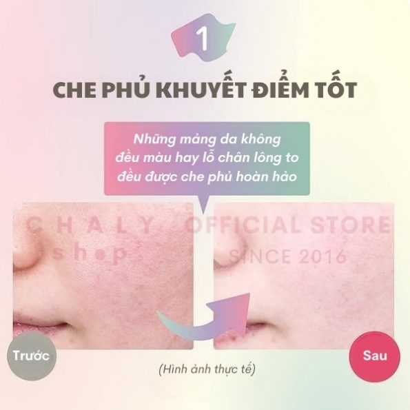 – Che phủ khuyết điểm trên da tốt, giúp làn da sáng mịn đều màu, cung cấp độ ẩm cho da, từ đó tạo lớp trang điểm mềm mịn, tự nhiên nhờ các thành phần dưỡng ẩm, làm đẹp da