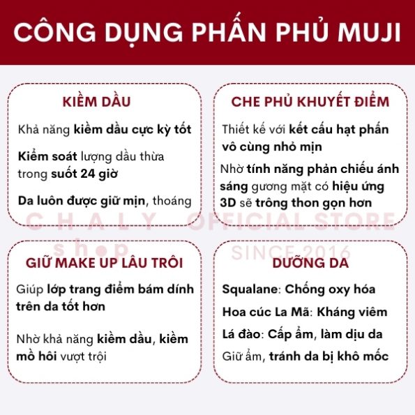 – Đồng thời khả năng kiềm dầu, kiềm mồ hôi cũng là yếu tố giúp cho lớp trang điểm giữ lâu và đẹp màu hơn suốt cả ngày khi apply phấn phủ Muji sau trang điểm