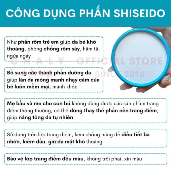 – Là sản phẩm thiết kế sử dụng cho trẻ từ sơ sinh, phấn phủ rôm Shiseido baby pressed powder có thành phần tuyệt đối lành tính