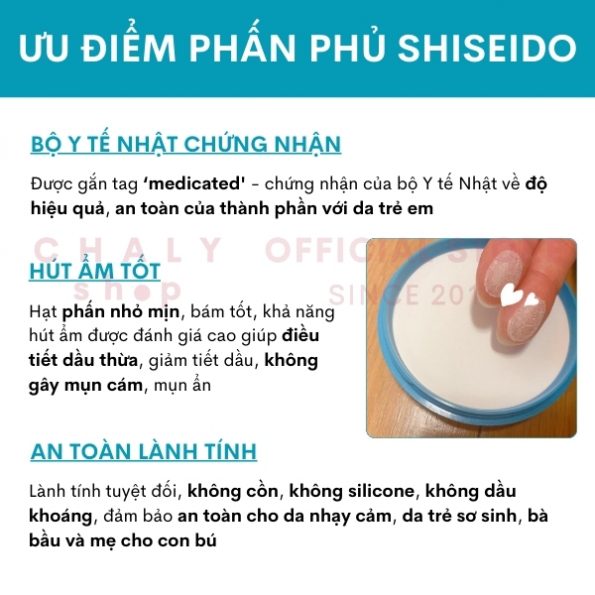 – Do vậy, bà bầu, mẹ cho con bú hay chị em da nhạy cảm e sợ các sản phẩm phấn nền, phấn phủ trang điểm gây hại cho da hoàn toàn yên tâm sử dụng phấn nén Shiseido nội địa Nhật như một sản phẩm trang điểm thay thế hiệu quả