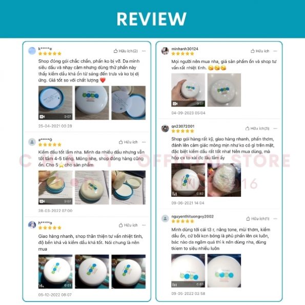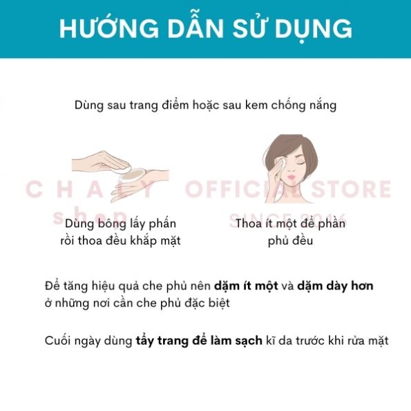 – Hạt phấn nhỏ mịn, bám tốt, thoáng bề mặt da. Không gây mụn cám, mụn ẩn khi dùng