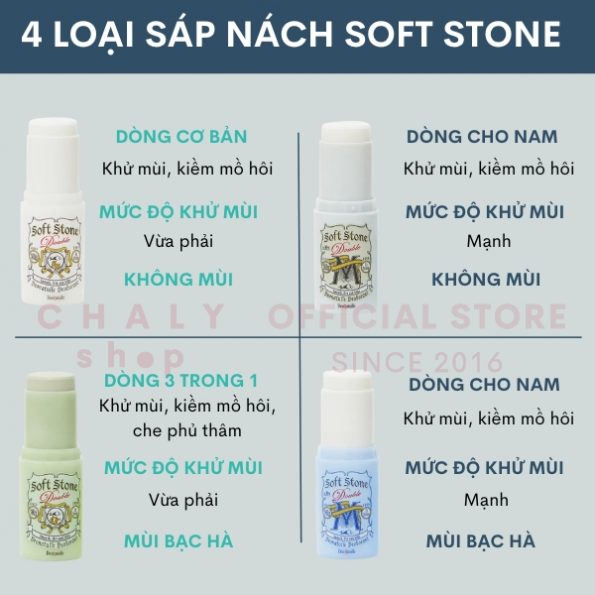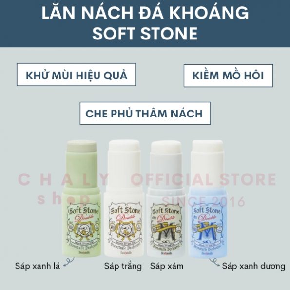 Lăn nách đá khoáng Nhật có 3 loại: Soft Stone màu trắng cho nữ, Soft Stone nam giới màu xanh và Soft Stone 3 in 1 màu xanh ngọc