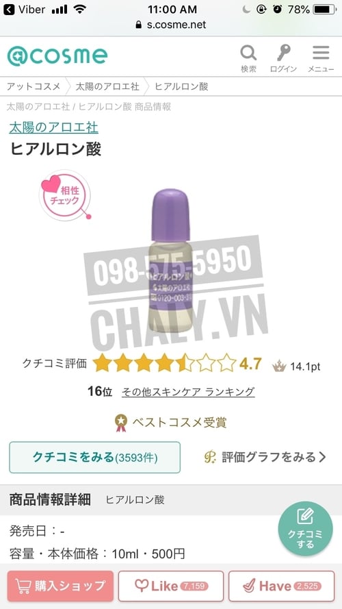 Tinh chất HA màu tím Taiyo no Aloe hiện sở hữu tới gần 3600 review khen ngợi trên chuyên trang đánh giá mỹ phẩm Nhật uy tín cosme.net