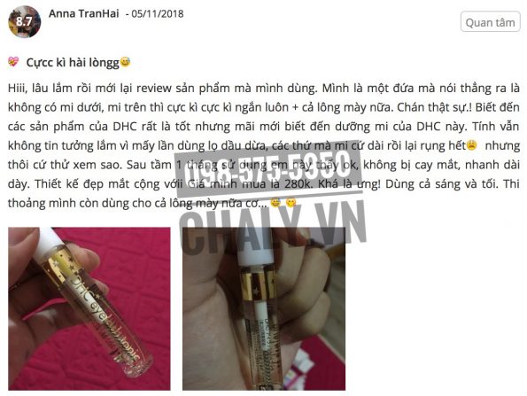 “Serum dưỡng dài mi dhc review: Dưỡng mi hôm bữa xài tốt lắm. Mi dài ra trông thấy”