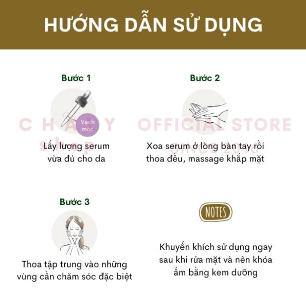 * Lưu ý: Nên sử dụng đủ lượng khuyến cáo của hãng. Trên cây spot lấy serum có 1 vạch kẻ sẵn. Mỗi lần đong lượng serum đúng tới vạch này để sử dụng là vừa đủ. Dùng ít serum quá sẽ không mang lại hiệu quả rõ rệt