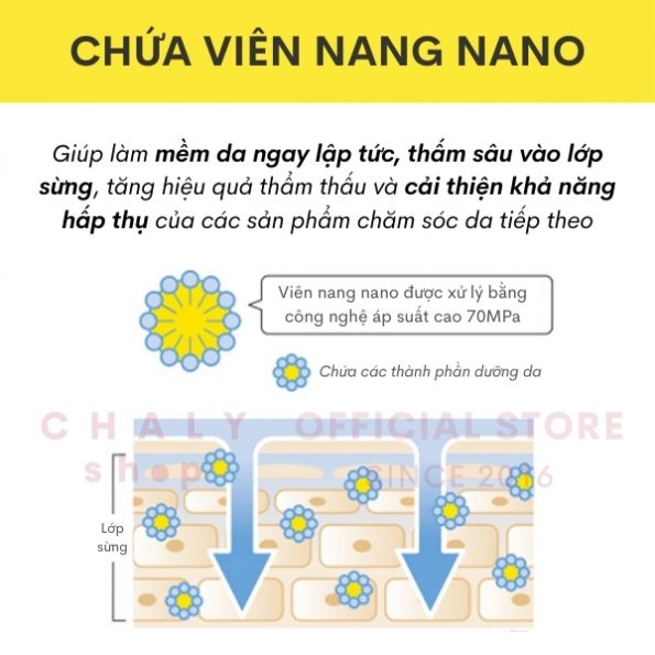 – Tinh chất serum chứa các viên nang nano, được chuyển đổi thành các hạt nano bằng công nghệ xử lý áp suất cao 70MPa giúp làm mềm da ngay lập tức và thấm sâu vào lớp sừng, tăng hiệu quả thẩm thấu và cải thiện khả năng hấp thụ của các sản phẩm chăm sóc da tiếp theo