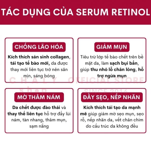 – Do đó, tinh chất retinol được sử dụng để trị mụn, làm mờ vết chân chim, nếp nhăn, làm mờ tàn nhang, nám, đồng thời còn làm đầy các vùng da bị sẹo rỗ nhẹ, sẹo mụn lâu liền