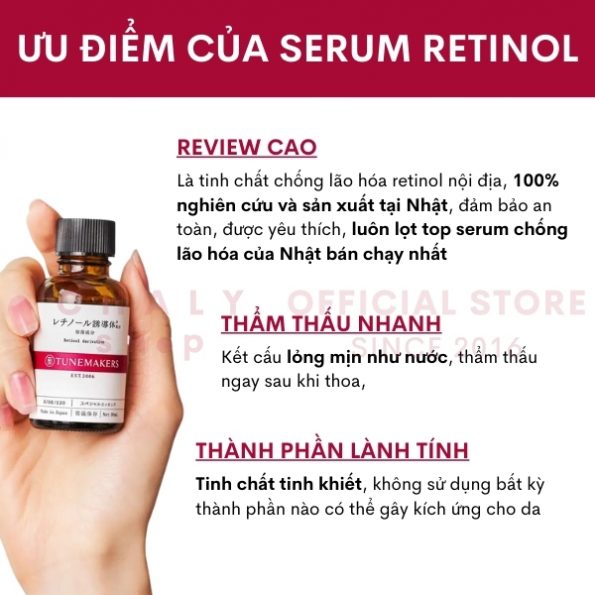 – Cùng với tinh chất vitamin C và serum ceramide blending 200, tinh chất retinol là serum chống lão hoá được yêu thích bậc nhất của Tunemakers Nhật Bản
