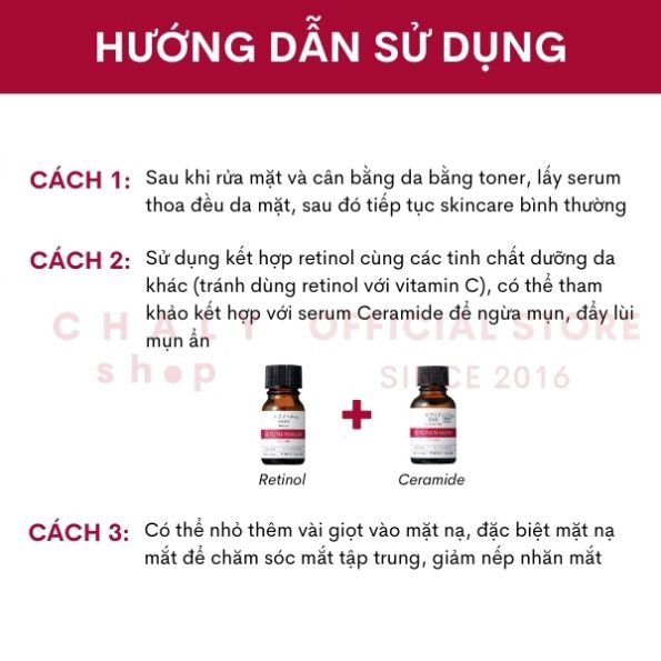 + Cách 2: Sử dụng kết hợp serum retinol cùng các loại tinh chất dưỡng da khác. Thứ tự sử dụng là retinol trước rồi tới các loại serum kia. Tuy nhiên tránh dùng retinol đồng thời với tinh chất vitamin C