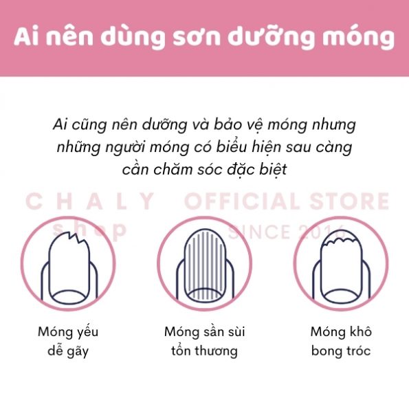 + Bảo vệ móng tay: Vừa dưỡng móng, vừa phủ lên móng 1 “lớp áo” bảo vệ móng khỏi các tác nhân gây hại từ môi trường tạo nên 1 lớp nền bám cứng chắc, chống vàng móng