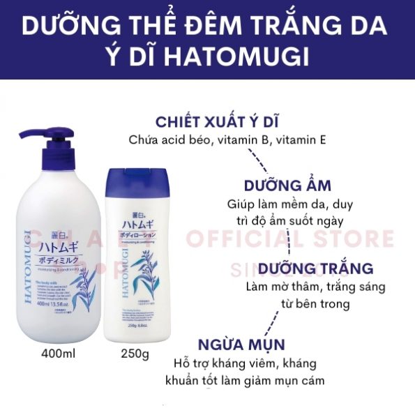 Review dưỡng thể trắng da ý dĩ ban đêm Hatomugi 250g & 400ml Nhật