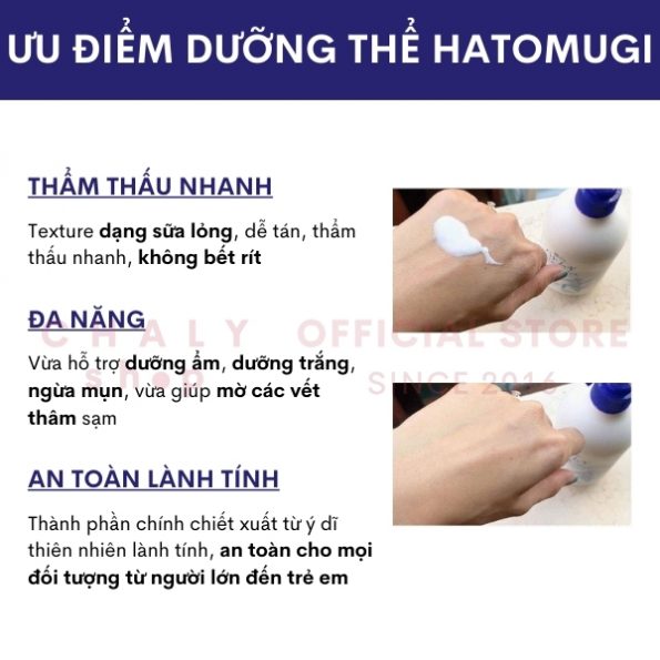 “Da mình cực kén kem dưỡng thể nên đã dùng quen loại này là không muốn thử sang các loại khác nữa. Sữa dưỡng từ ý dĩ Hatomugi thì quá nổi tiếng rồi. Chất lượng tốt, chất kem mềm mịn, thấm nhanh, không lộ vân kem, không nhớt da, dùng rất dễ chịu. Sau khi tắm cứ chăm chỉ thoa khắp body là da được dưỡng cả ẩm lẫn trắng luôn nhé”